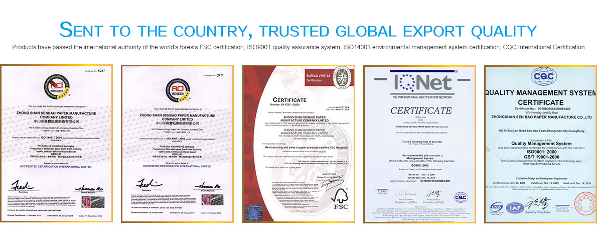 Zhongshan Senbao Paper Manufacturing Co., Ltd.  is located in Sun Yat-sen’s former residence health city - Zhongshan City, known as the town of water town, the location and Guangzhou Nansha junction, and in Dongguan City, Shenzhen, Guangzhou, Jiangmen, Zhuhai, Foshan, About 60 km, convenient transportation and beautiful environment, is a professional production of environmentally friendly Zhisu, living paper in one of the company. The company plant covers an area of over 28,000 square meters, the product through the ISO9001 quality assurance system, ISO14001 environmental management system, SGS quality certification standards and ROHS requirements of the technical indicators, and waterproof effect processing.